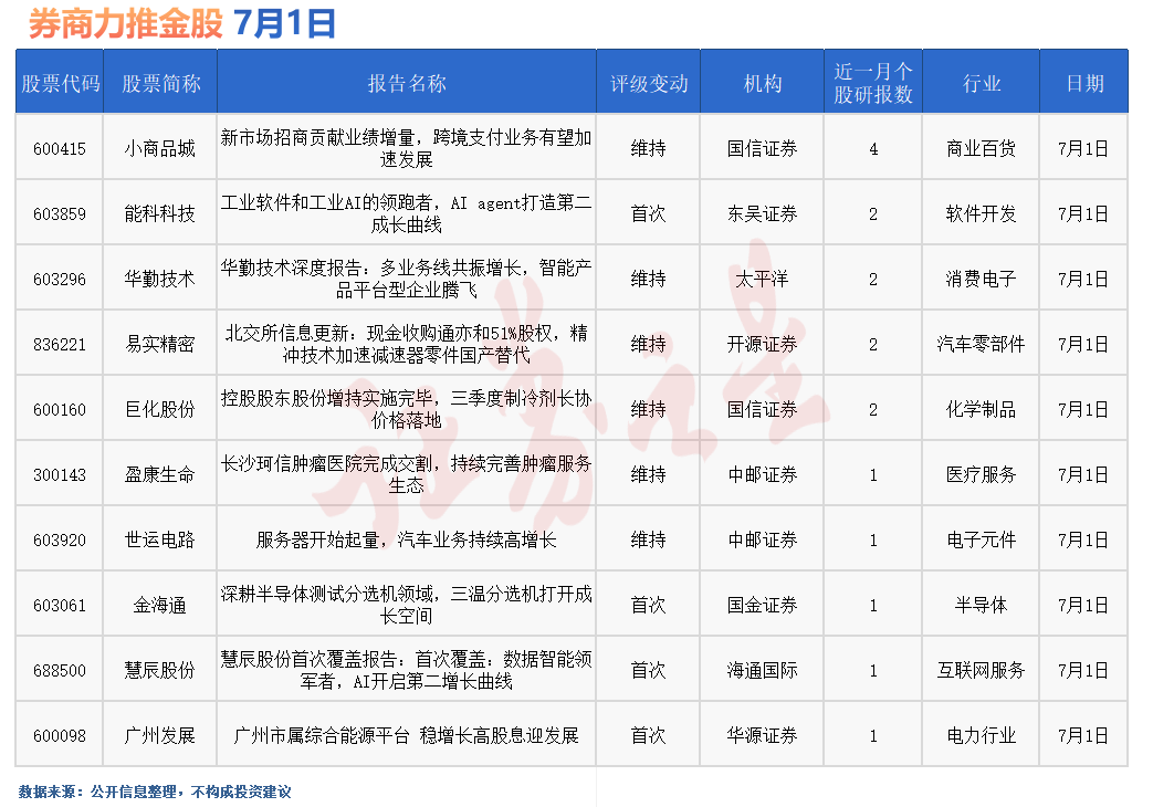 据证券之星数据库不完全统计,7月1日券商共给予超10家A股上市公司“买入”评级。从行业分布看,券商7月1日关注的个股聚焦于商业百货、软件开发、消费电子、汽车零部件、化学制品、医疗服务、电子元件、半导体、互联网服务、电力行业等行业。